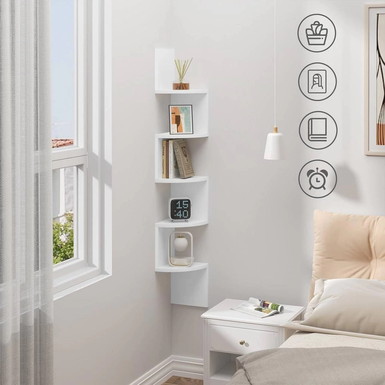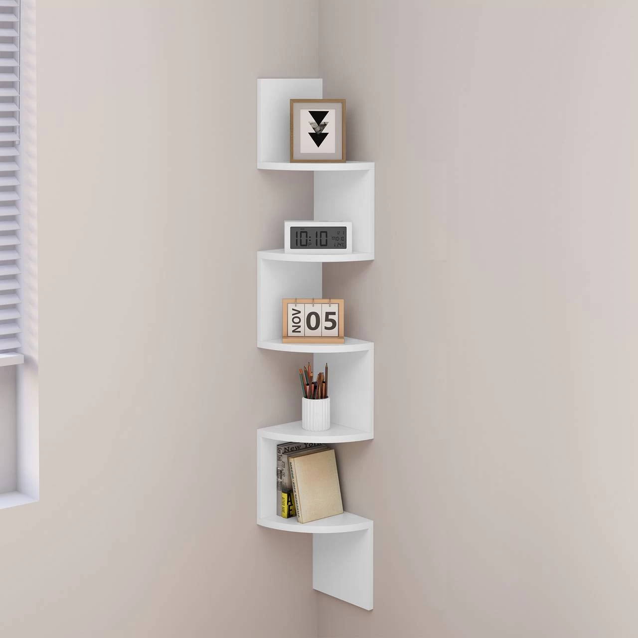 - ELEGANT & STILVOLL: Das Zickzack-Eckregal mit Fächerform-Ablagen ist einzigartig, schön und sicher. Es passt perfekt in die Wandecke, um Bilderrahmen, kleine Topfpflanzen usw. unterzubringen, und macht die Ecke auch zu einem Highlight Ihres Zuhauses.