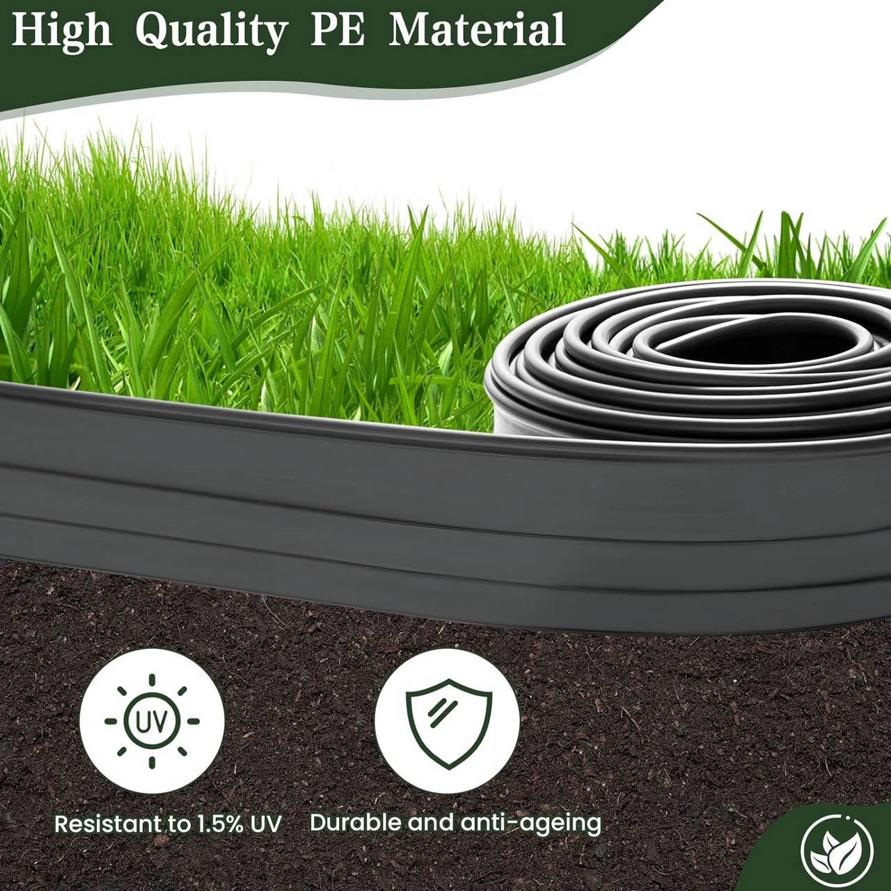 UV-beständig: Die Beetumrandung aus PE kann 1,5 % UV-Strahlung standhalten, wodurch das Ausbleichen und die Alterung erheblich vermindert werden.