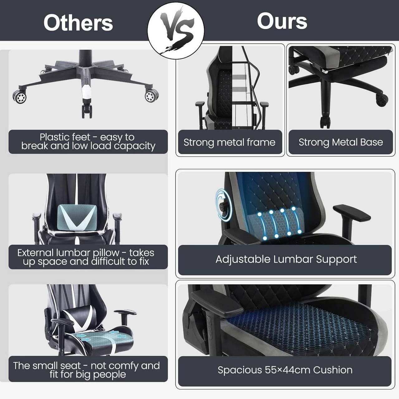 - MEHR STABILITÄT: Im Vergleich zu den herkömmlichen Gaming-Stühlen mit Kunststoffbeinen ist dieser Sessel mit einem vergrößerten Metallfuß und einer Rückenlehne mit Metallinnenrahmen ausgestattet, damit er langlebig, rostfrei ist und bis zu 150 kg tragen kann.