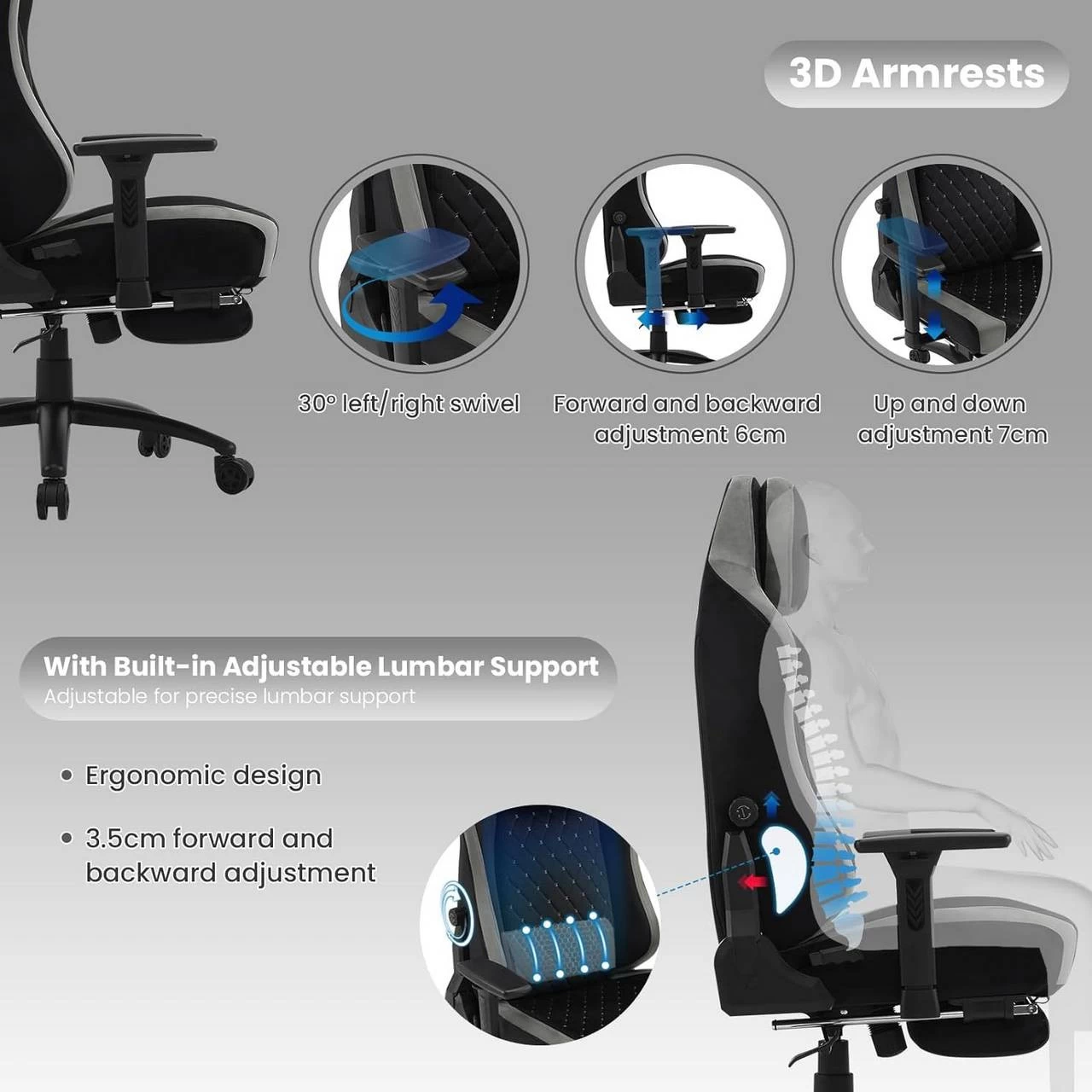- ERGONOMISCHER STUHL: Der Gamingstuhl hat eine Kopfstütze und eine platzsparende integrierte adaptive Lendenwirbelstütze, die sich durch Drehen des Knopfs in der Krümmung einstellen lässt (vorwärts und rückwärts 3,5 cm), um Ihre Lendenwirbelsäule perfekt zu unterstützen. Dieser Stuhl ist außerdem um 360° drehbar und beweglich, verfügt über eine verstellbare Sitzhöhe und 3D-Armlehnen für multidirektionale Armstütze, was Ihre Bedürfnisse voll und ganz erfüllt.