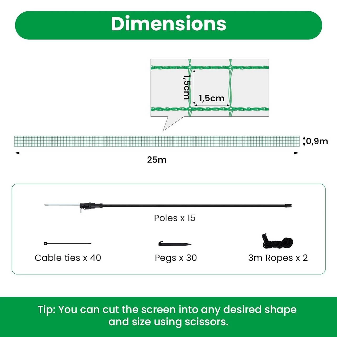 Angemessene Maschengröße: Die Größe von 1,5×1,5 cm vermeidet Knoten im Netz. Und die kleinen Tiere können es nicht durchdringen und sich nicht darin verfangen.
