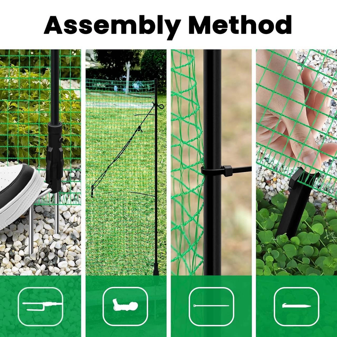 Leichte & Stabile Montage: Mithilfe von Fiberglaspfählen können Sie den Zaun ganz einfach in den Boden stecken. Die Windenseile, Erdnägel und Kabelbinder bieten mehr Stabilität.