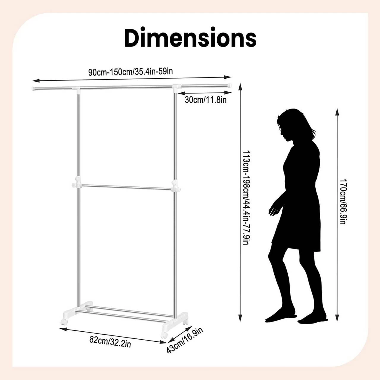 Breite und Höhe Verstellbar: Der ausziehbare Kleiderständer kann je nach Bedarf in der Breite (90-150 cm) und Höhe (113-198 cm) angepasst werden.