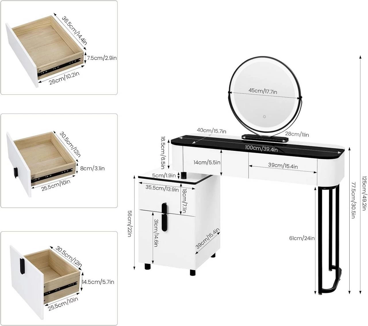 - Breite Tischplatte: 100×40 cm, bietet offenen und zugänglichen Platz für Kosmetika