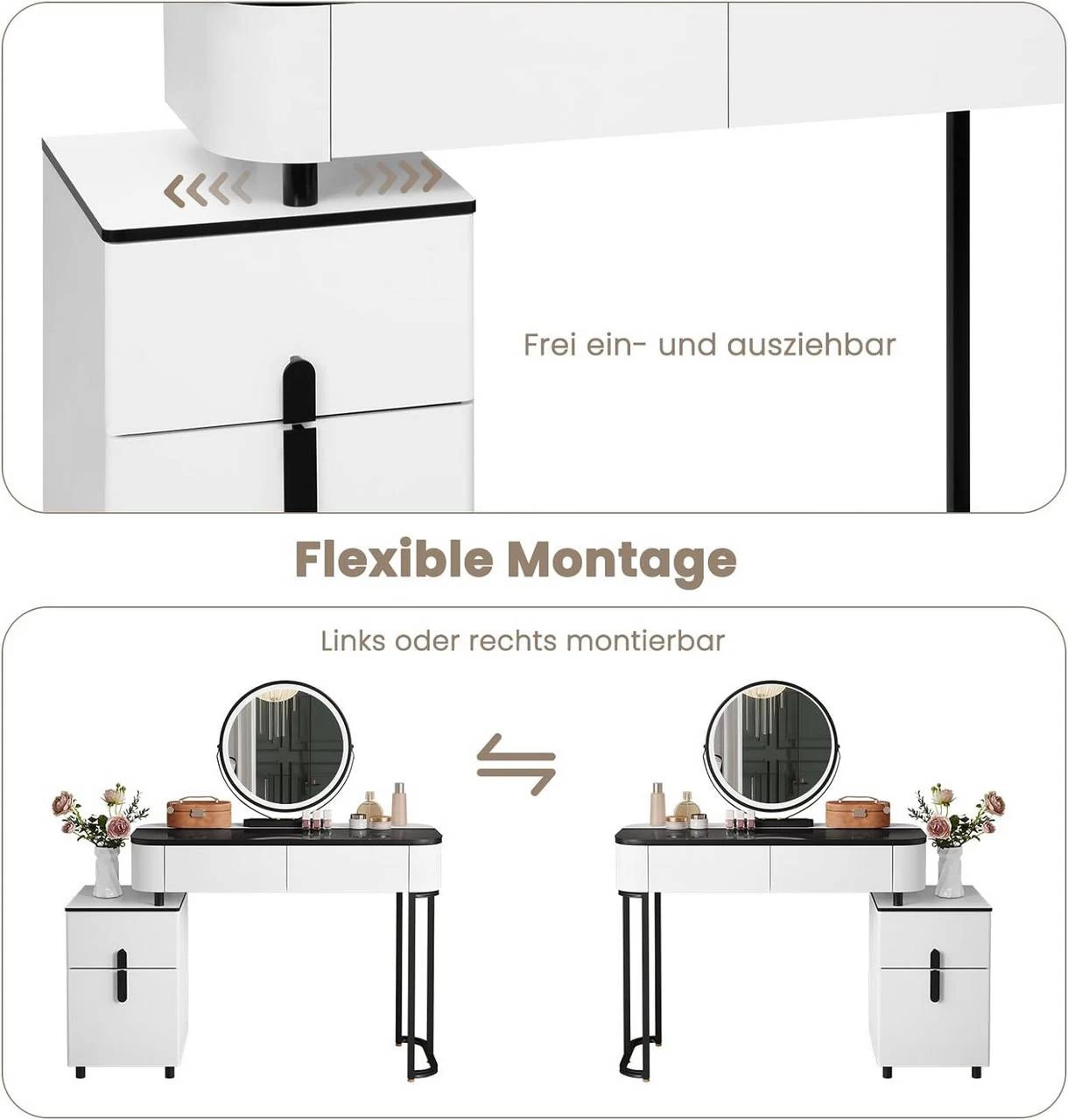 - EIN ECHTER HINGUCKER: Der Kosmetiktisch in Weiß und Schwarz wirkt sehr modern und elegant und ist damit eine attraktive Dekorations- und Aufbewahrungslösung für Schlafzimmer, Garderobe usw. Ohne Spiegel lässt er sich auch als Schreibtisch dienen.