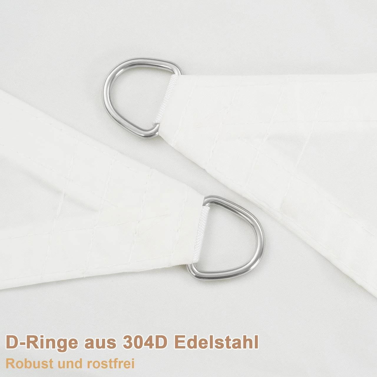 - HOCHWERTIGES ZUBEHÖR: An jeder Ecke des wasserabweisenden Sonnensegels befindet sich ein robuster und rostfreier D-Ring aus Edelstahl 304 (Stärke: 5 mm). Je nach Form des Segels werden 3 oder 4 PE-Seile von ca. 1,5 m Länge zur Befestigung geliefert.