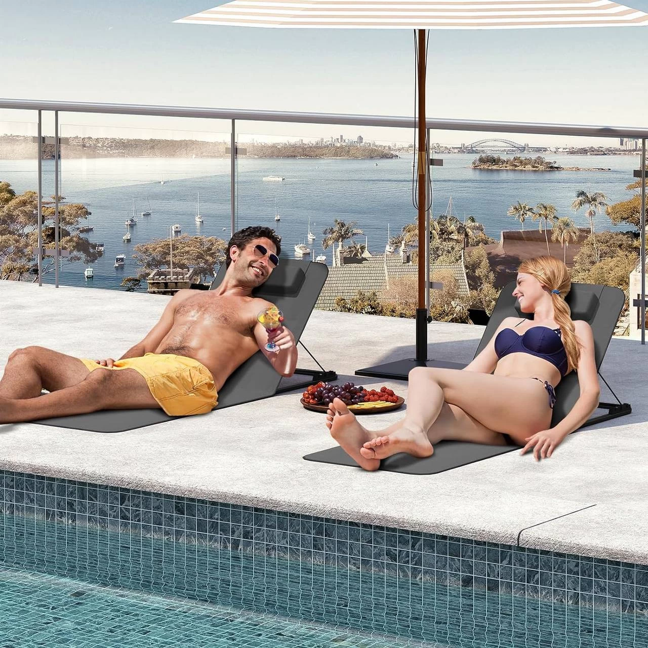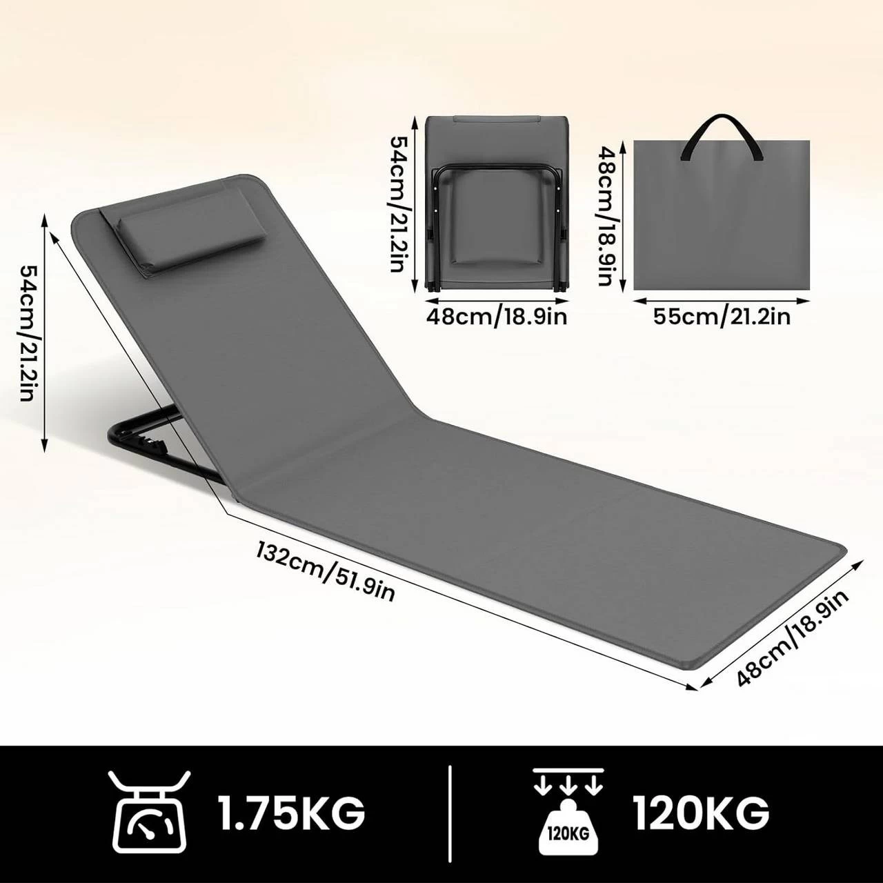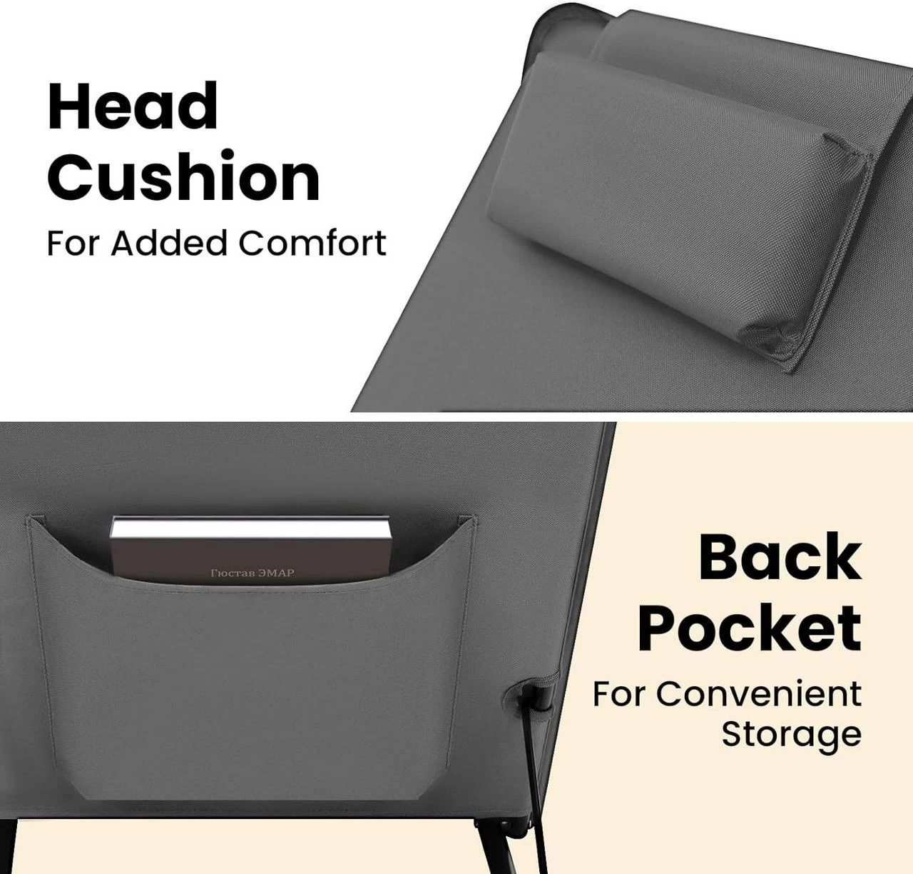 - VERSTELLBARE RÜCKENLEHNE: Mit Hilfe von Metallstangen und Kartensteckplätzen lässt sich die Rückenlehne der Strandstuhl in 3 Winkeln einstellen, sodass Sie die bequemeste Liege- oder Sitzposition finden. Das gepolsterte Kopfkissen sorgt für mehr Komfort.