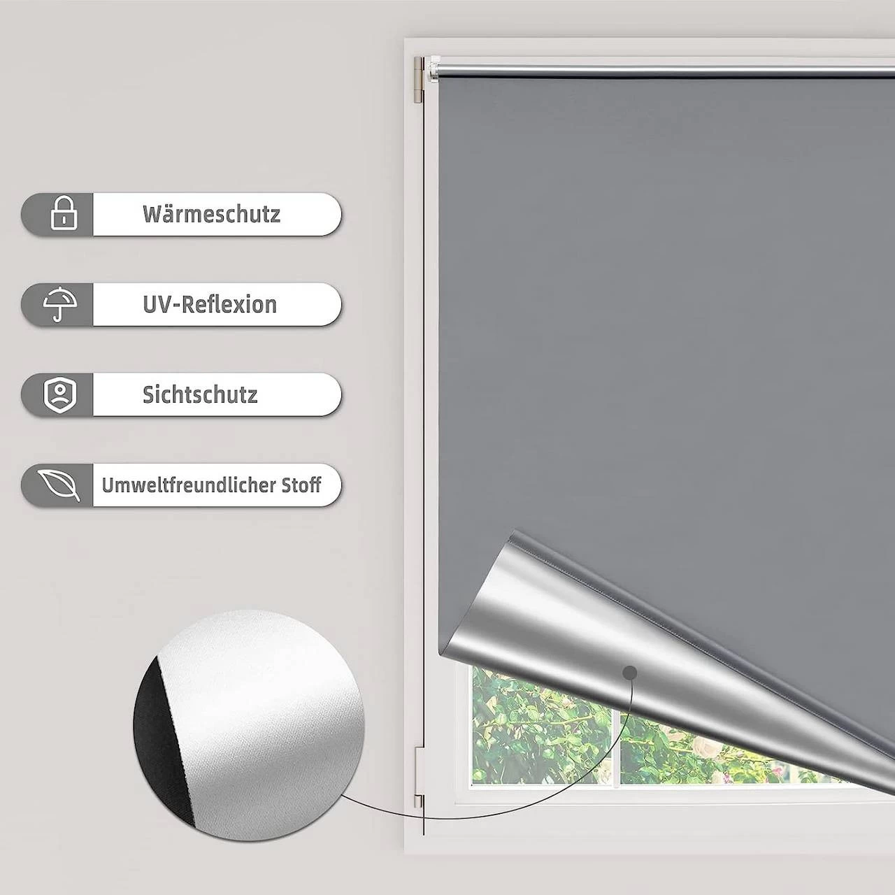 - WÄRMEISOLIERUNG: Die silberne Aluminiumbeschichtung auf der Rückseite des Fensterrollos hat eine gute wärmeabweisende Wirkung. Im Sommer kann sie die Sonnenstrahlung reflektieren und verhindern, dass sich der Raum überhitzt. Im Winter kann es die kalte Außenluft abschirmen und einen warmen und gemütlichen Lebensraum schaffen. Dieses blickdichte Rollo eignet sich für Schlafzimmer, Kinderzimmer, Wohnzimmer, Büro, Badezimmer usw.
