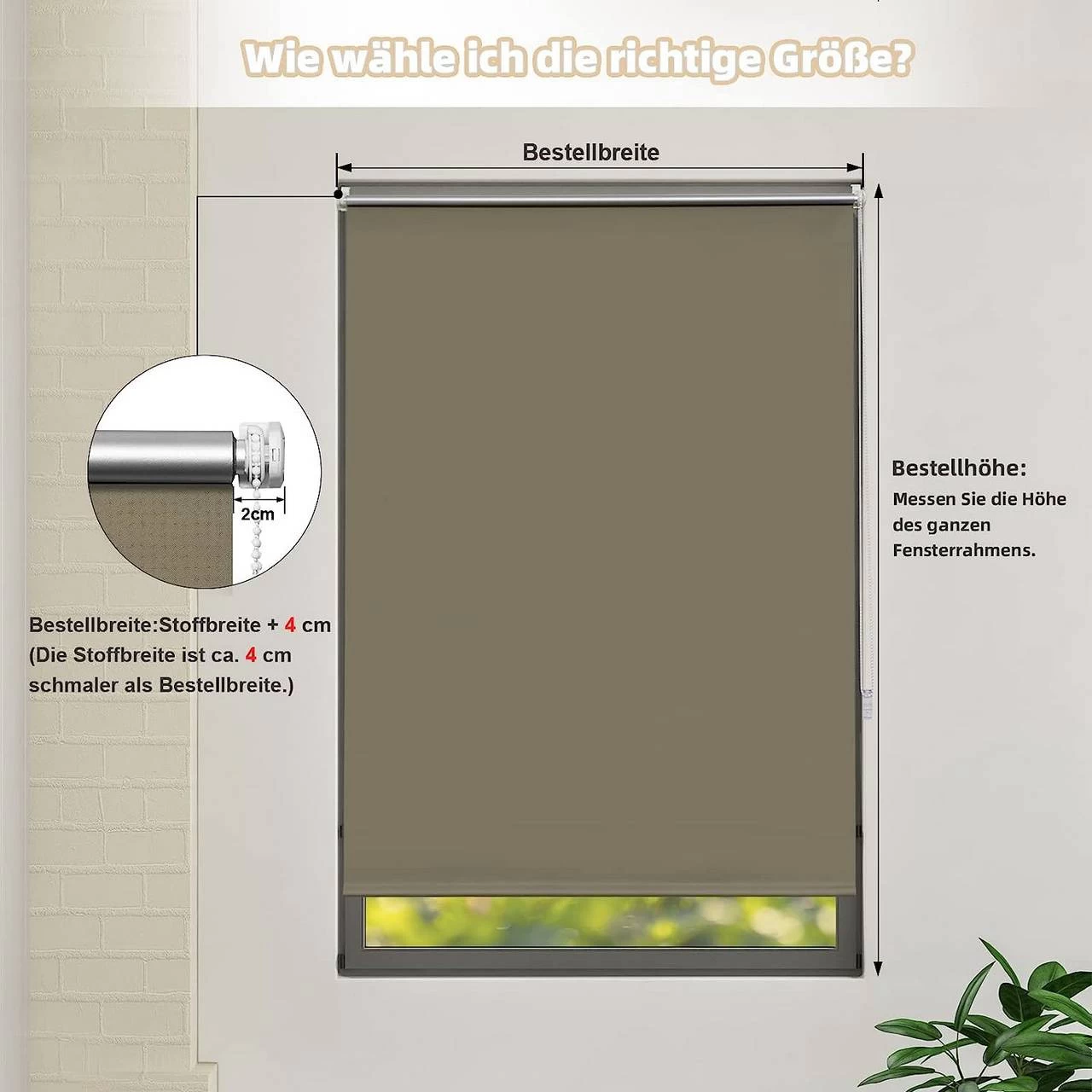 - ANMERKUNGEN: 1. Die Stoffbreite ist ca.4 cm schmaler als die angegebene Gesamtbreite! Wenn Sie beispielweise ein 60 cm breites Rollo erhalten, beträgt die tatsächliche Breite des Stoffes etwa 56 cm. Messen Sie daher bitte vorerst die Größe Ihres Fensters, um einen optimalen Effekt zu erzielen. 2. Bestellhöhe: Messen Sie bitte die Höhe des gesamten Fensterflügels